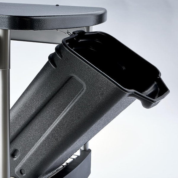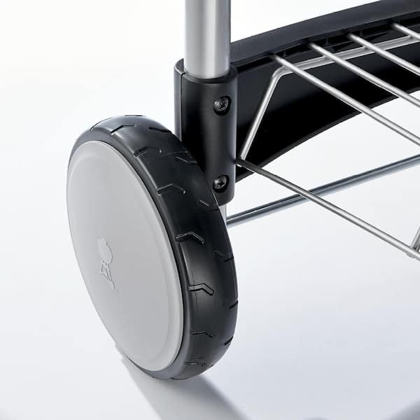Steel cart frame includes: 1 char-bin weather-protected charcoal container 1 removable LCD timer 3 tool hooks 1 wire bottom rack 1 painted metal side table 2 locking caster wheels and 2 all-weather 8 in. rubber-molded wheels