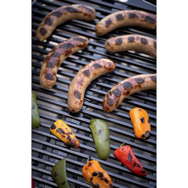 Porcelain-enameled cast-iron cooking grates; infinite heat control settings; cast aluminum lid and body; glass-reinforced nylon frame