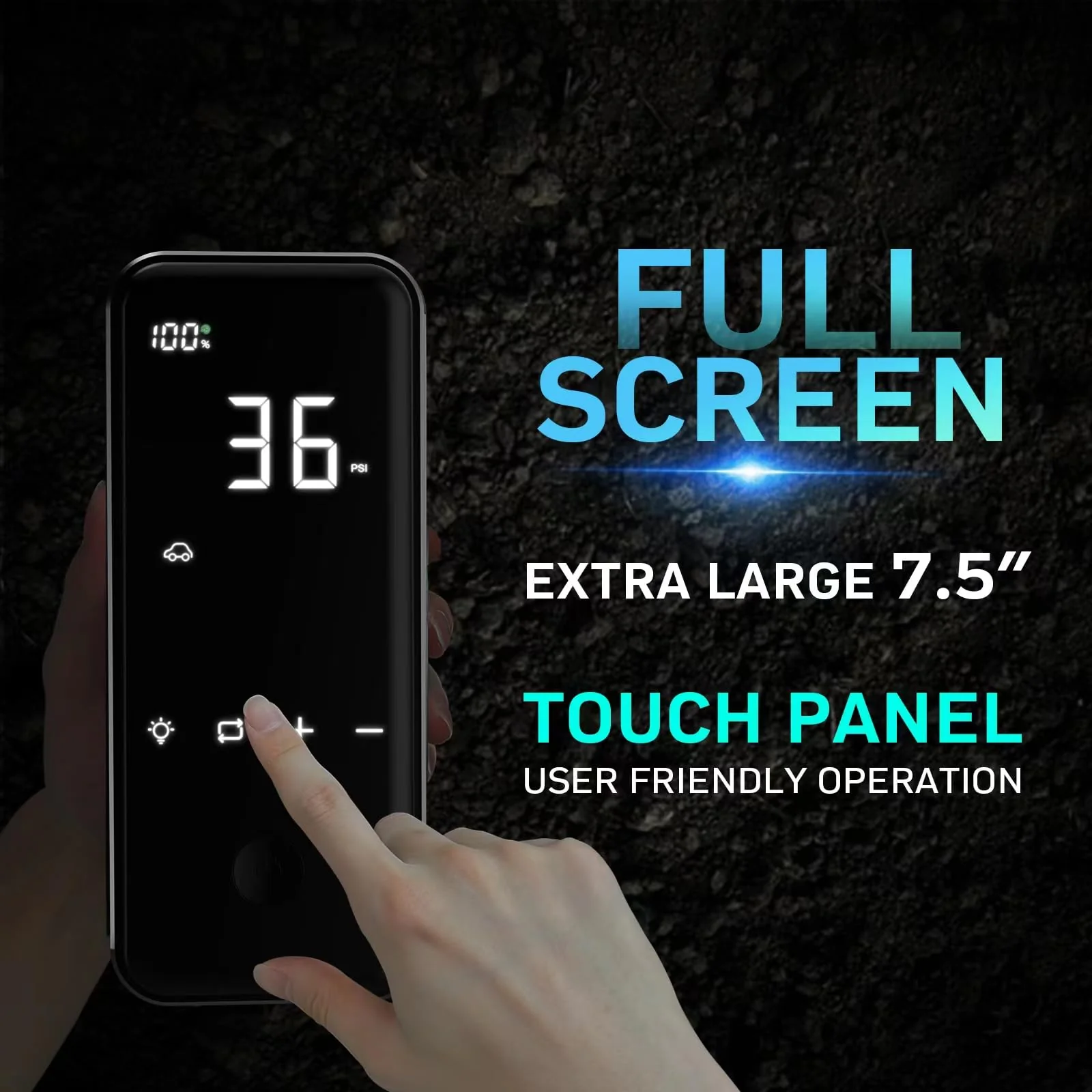 - Full Screen Touch Panel: Humanized interface with full screen design looks just so cool. Enjoy its sleek touch in every use. Touch screen light makes this car tire inflator portable air compressor really practical to use even in the dark.