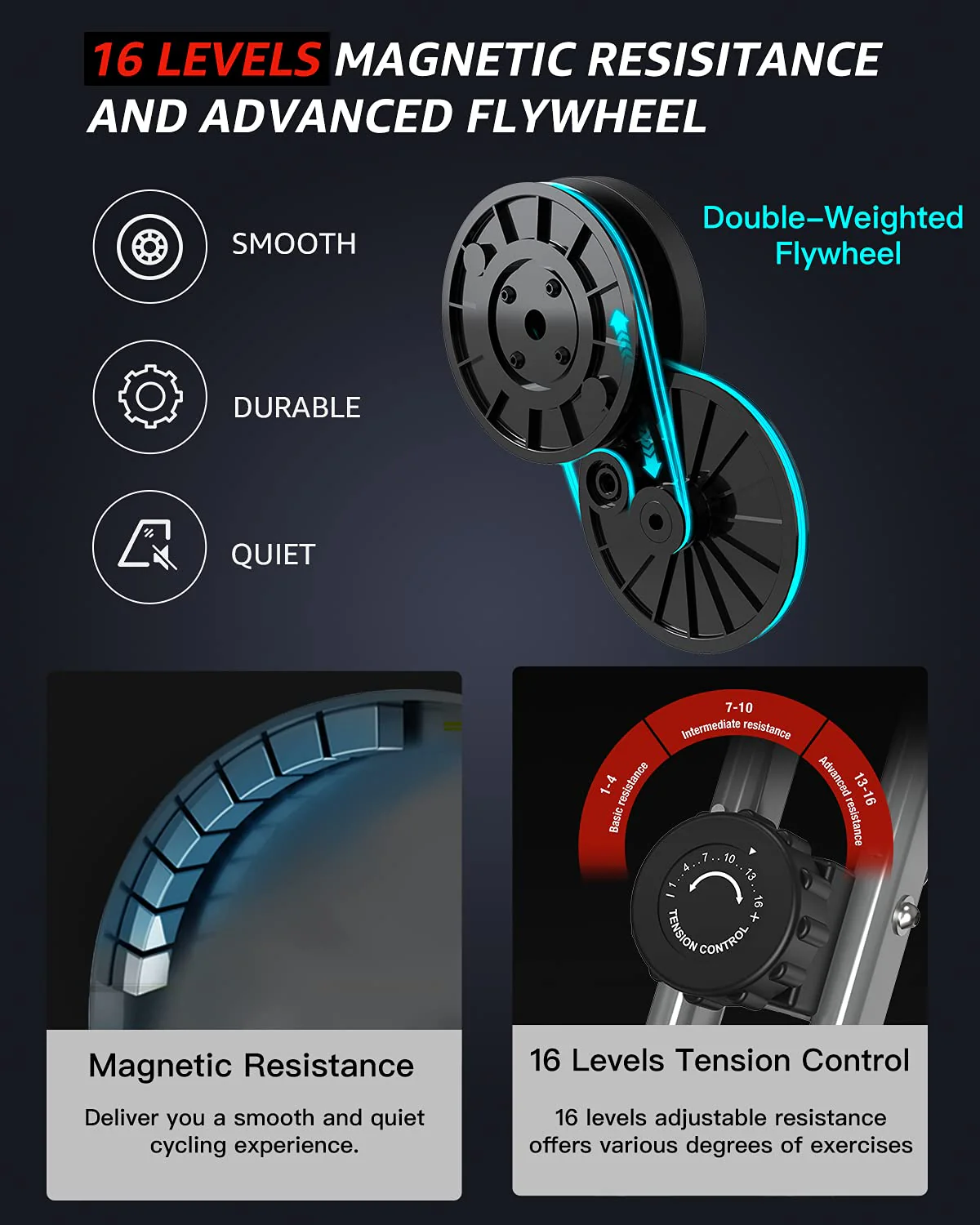 - ��SUPER QUIET�� The upgraded magnetic resistance keeps the exercise bike very quiet while riding. it also provides 16 levels of gear adjustment for you to ride freely. Heavy-duty steel frame combined with X-type design physical balance theory. provide you a stable exercise bike. support limited to 330 LB Capacity