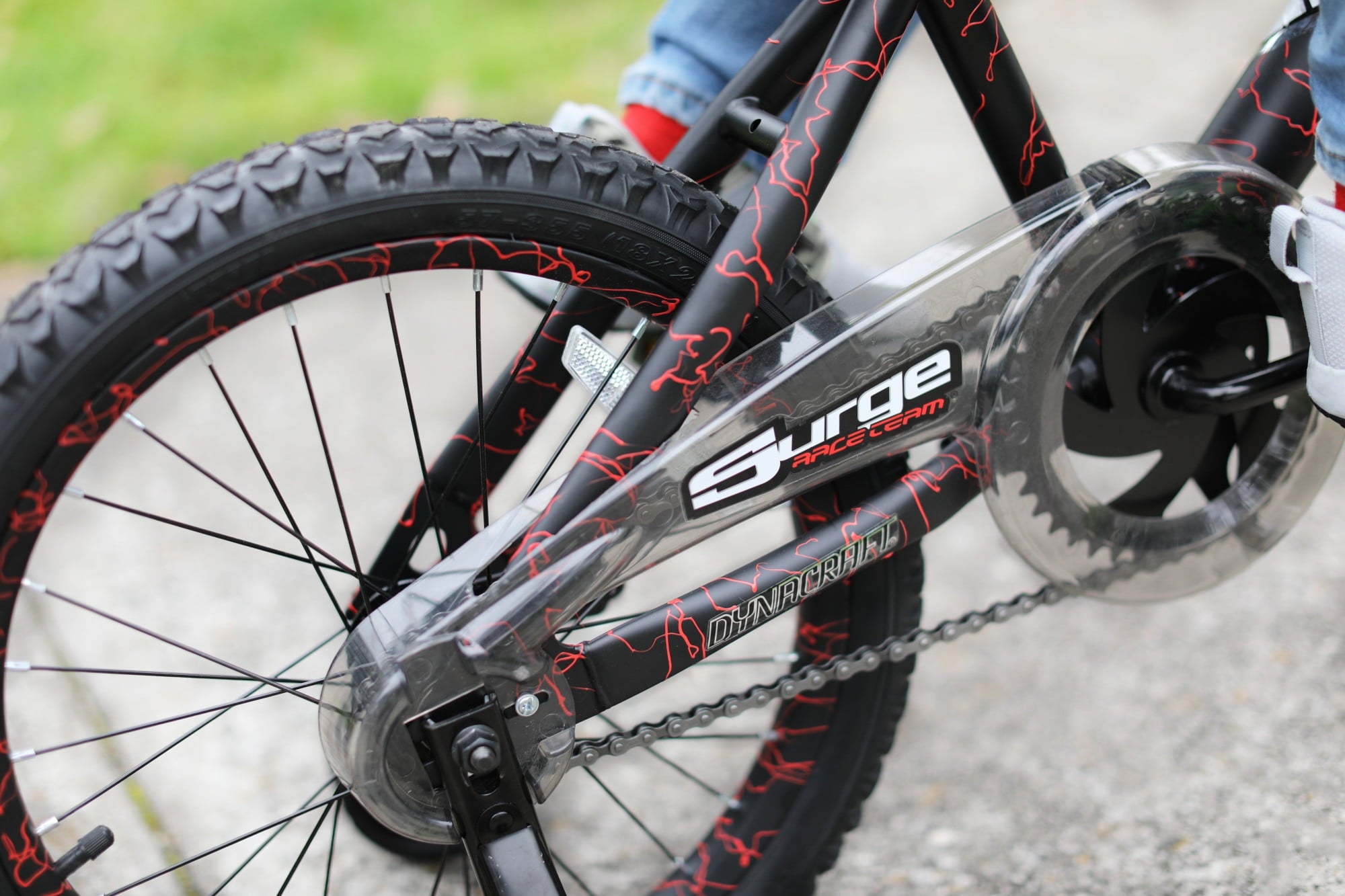 Features:Sturdy steel frame with deluxe red webbed matte black paint finish 18 inch wheel size for rider 6-9 years or 40-48\ tall Front caliper brake and rear coaster brake Custom handlebar pad and racing shield Adjustable and removable training wheels Limited lifetime warranty on frame and fork