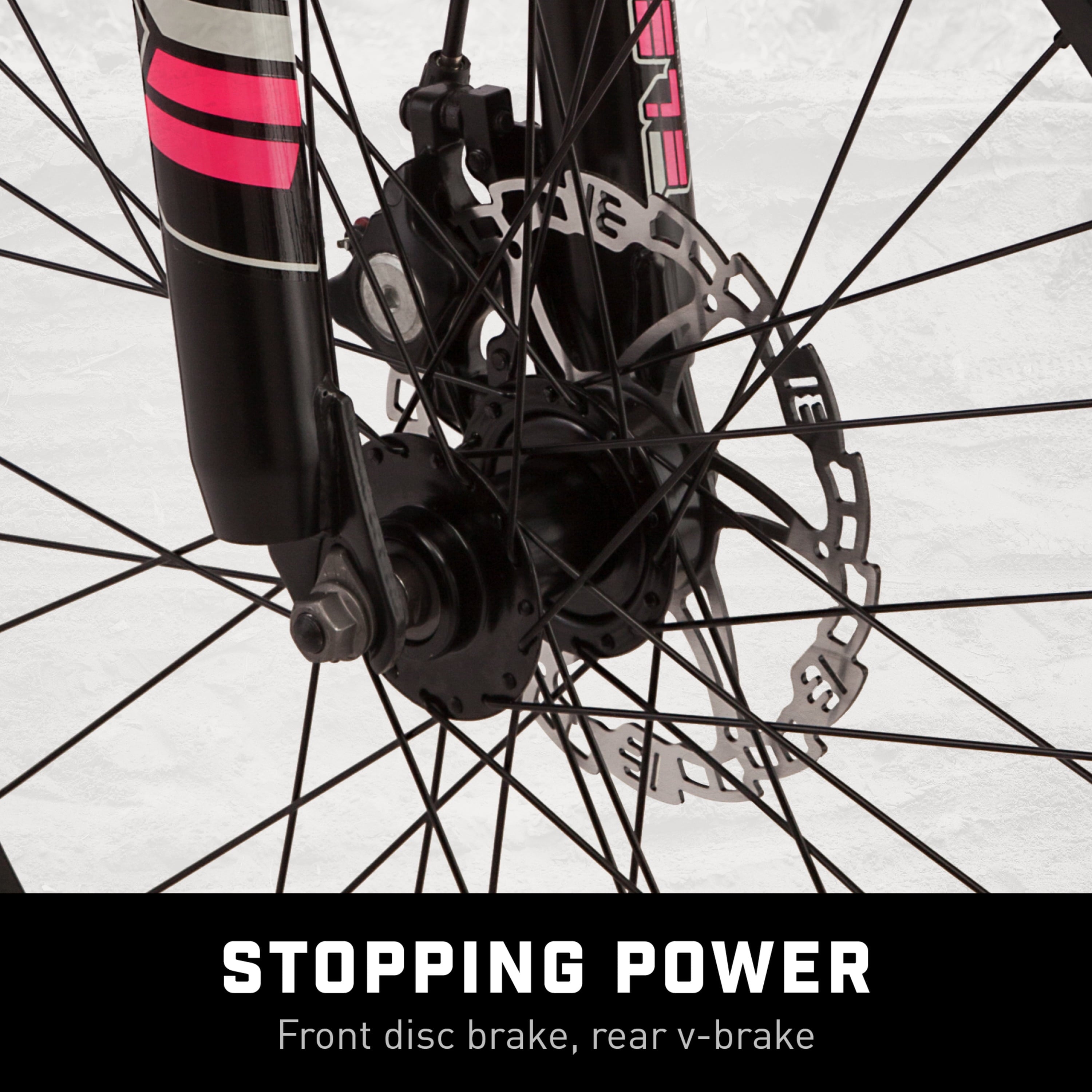 - Front disc brake and rear V-brake deliver crisp controlled stops.