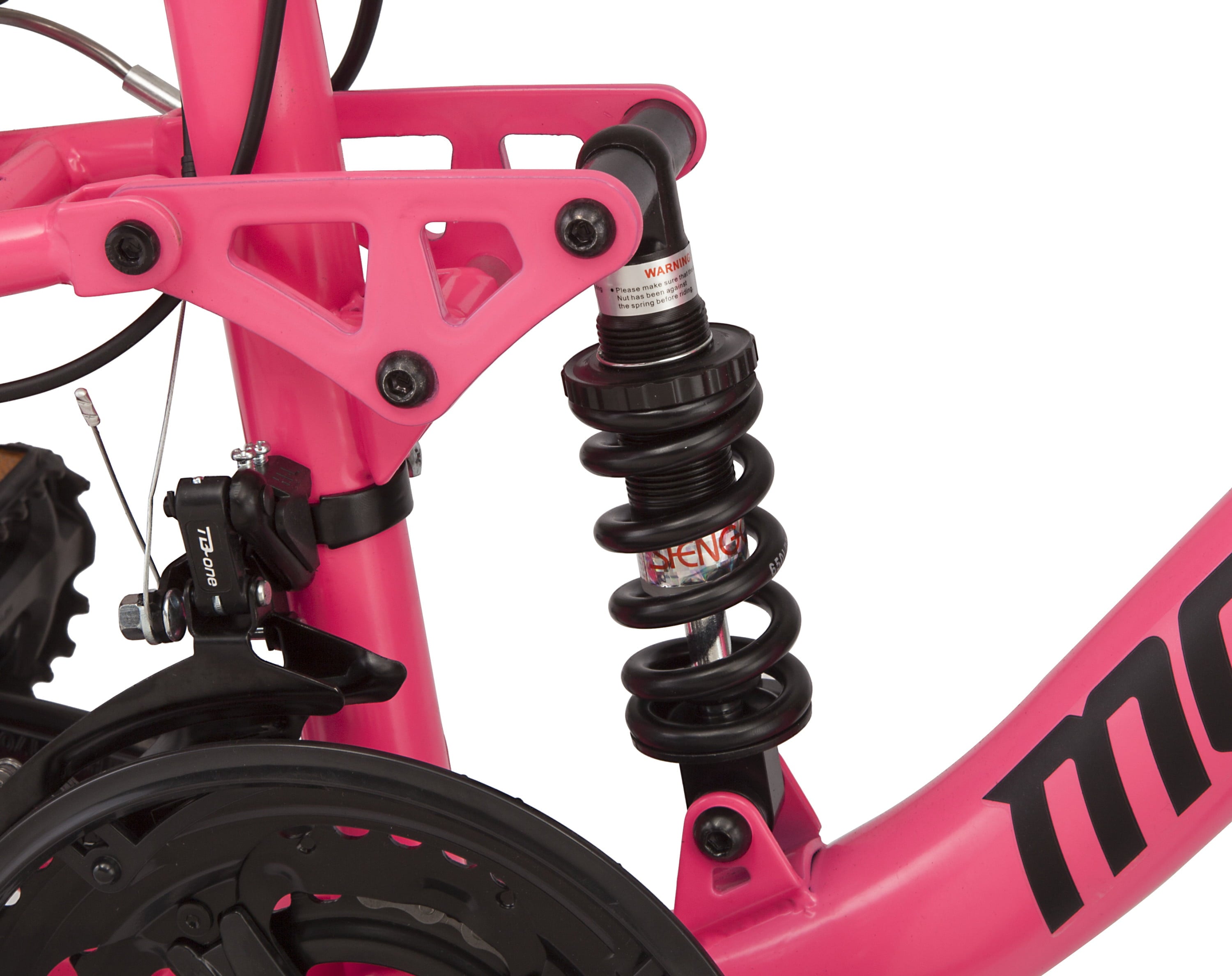 - Mongoose full suspension frame helps to absorb bumps in the trail for a smoother ride.