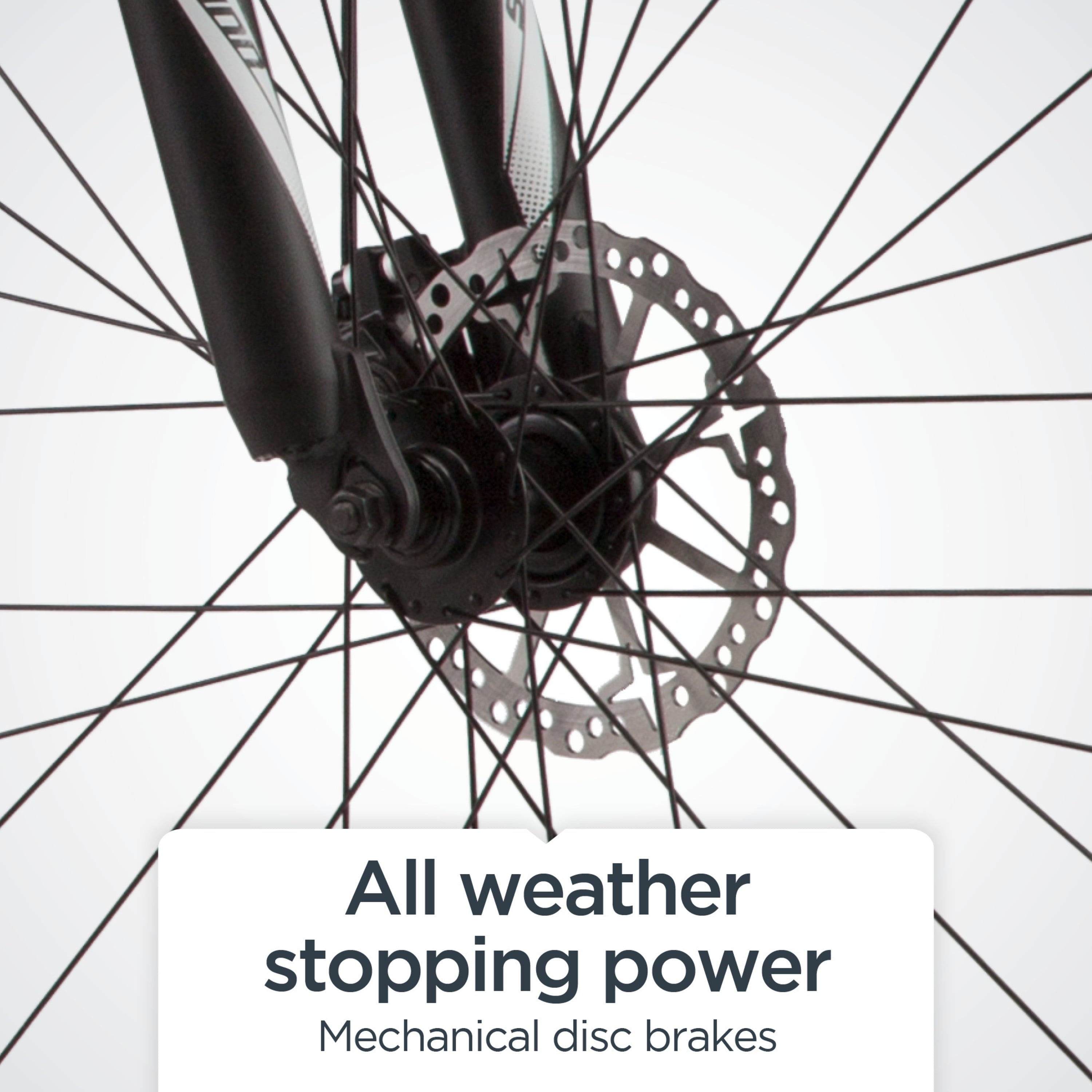 • Durable steel hybrid frame with suspension fork to absorb bumps in the road and provide a more comfortable ride.